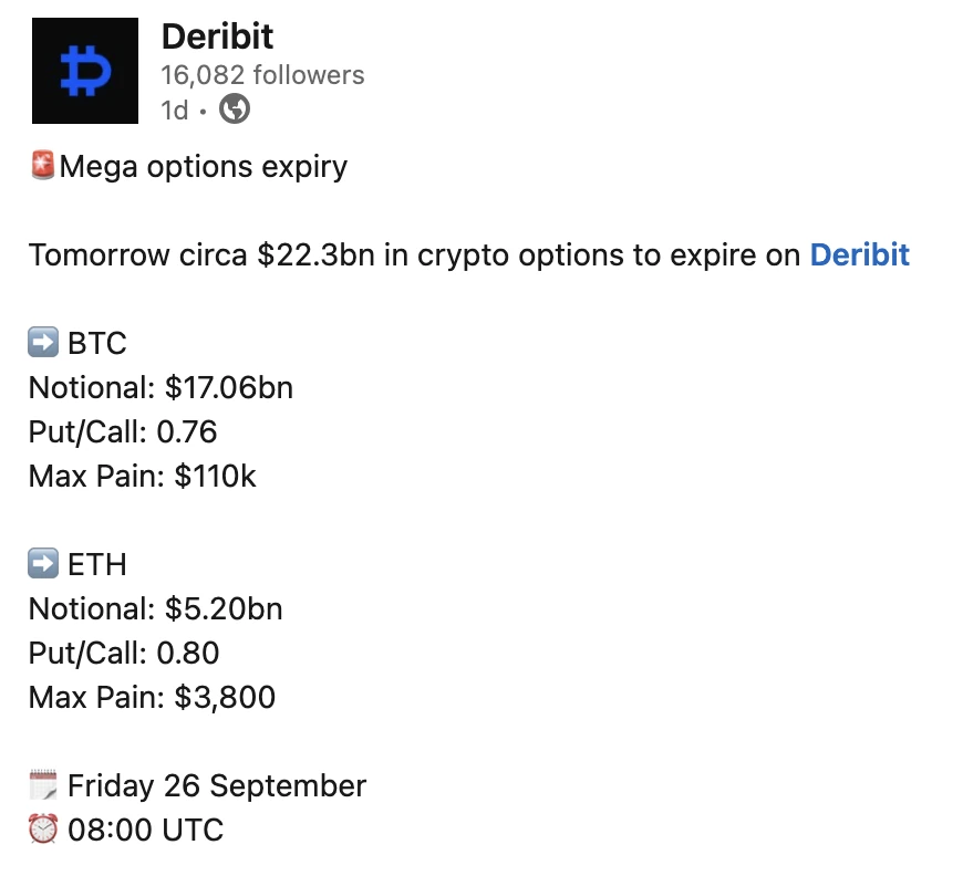 Bitcoin options expiry at Deribit exchange on Fridays. Over $17 billion notional rolling off Deribit today. The Internet buzzes with gamma wall charts and max pain predictions. Everyone's talking about the inevitable pin to $114k where maximum option seller profit lies.