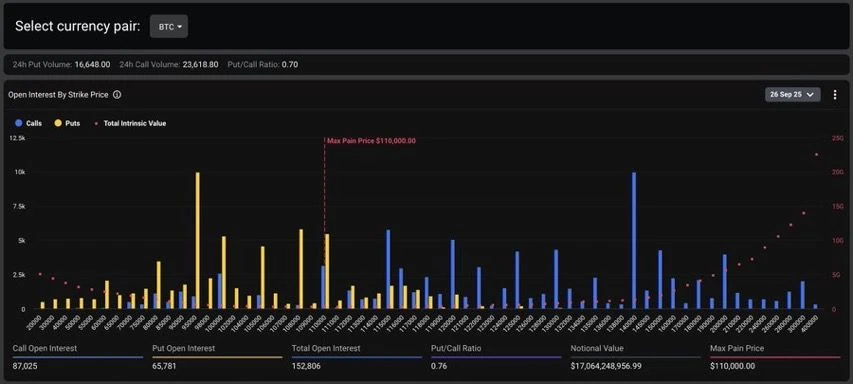 Figure 1: Open Interest for BTC as derived one day prior to options expiry key date on 2025-09-26 with derived max pain of $114k based on Deribit's data based on our methodology.