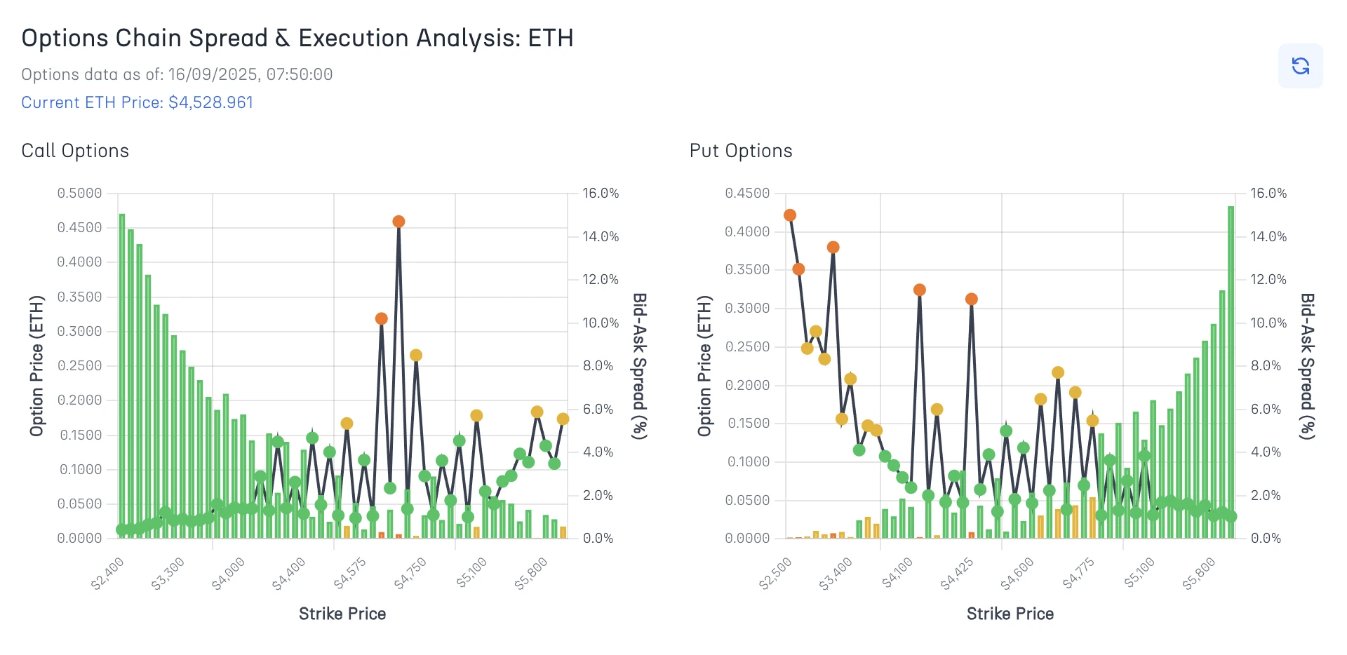 Ethereum options at $4,529 demonstrate why this market continues to set the standard for crypto options execution quality. With average spreads of just 2.8% for calls and 4.3% for puts, ETH options now approach the execution efficiency of many traditional equity options.